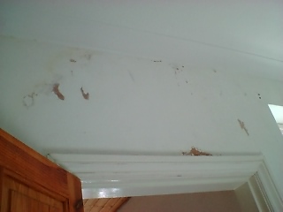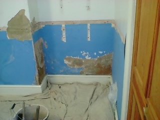 !ダイニングルームの壁紙下地貼りは7割終了し、後はダメージの大きい部分を残すのみとなりました。大工のショーンが新しく塗ってくれた壁も乾きつつあるので、ダメージ部分にも早速取り掛かりました。でもダメージが大きい分、壁紙下地を貼るまでの作業も多め
