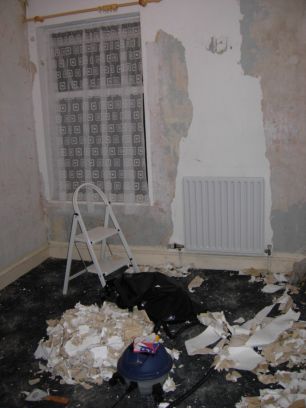 朝から壁紙をはがした壁をサンドペーパーでシャーシャーこすってました。かなりの騒音
