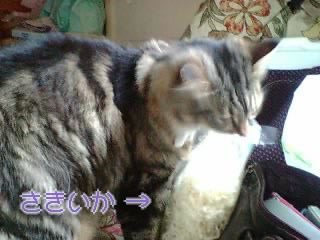 !あまりのかわいさに、さきいかをプレゼント。口でくわえた後、一旦床に置いてゆっくり食べてるもんだから、時々犬のガーティーに横取りされて、そして私の方を見て「取られたんですけど…
